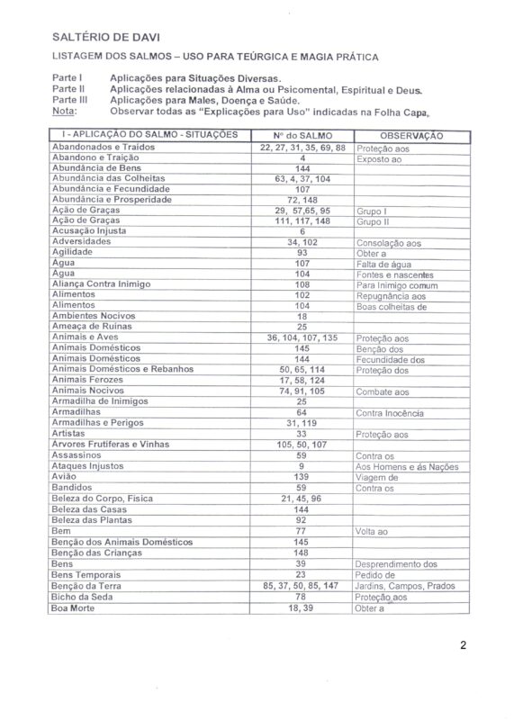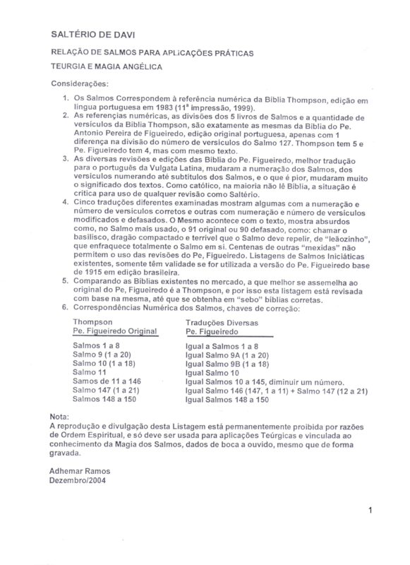 Esta Relação É Cópia do Original Que Foi Entregue aos Alunos Que Realizaram o Curso Magia Prática – Magia dos Salmos. Ela auxilia e complementa os ensinamentos passados pelo Prof. Adhemar Ramos no Curso.